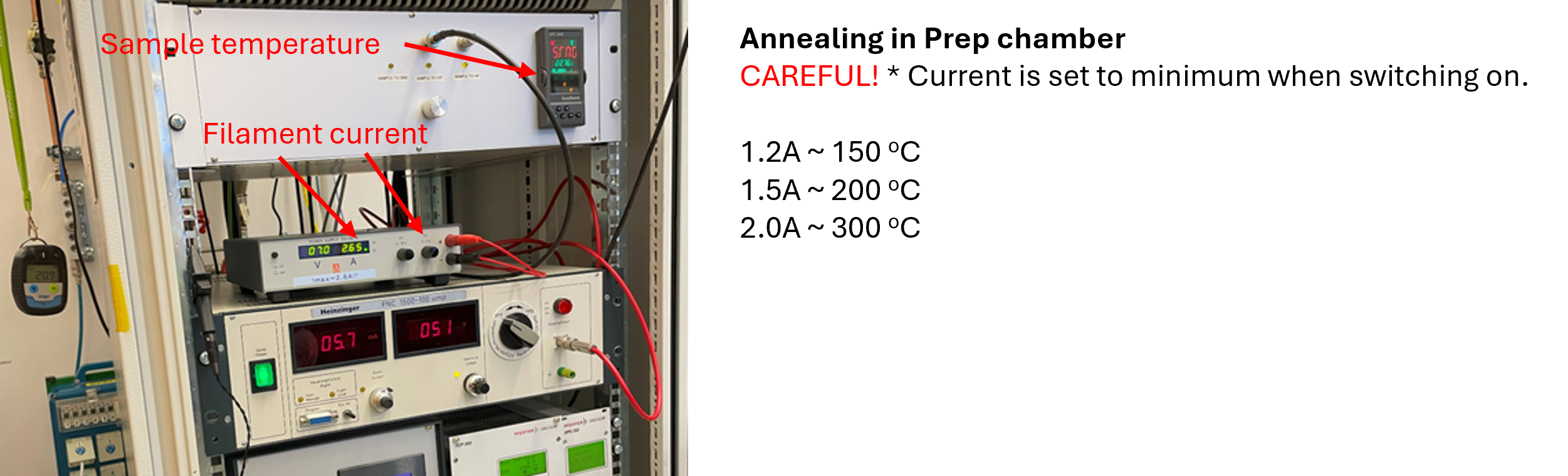 The sample temperature can be estimated from filament current as: 1.2 A ~ 150 °C ; 1.5 A ~ 200 °C; 2.0 A ~ 300 °C